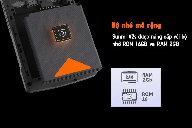 Sunmi V2s được nâng cấp với bộ nhớ ROM 16GB và RAM 2GB, giúp người dùng lưu trữ và xử lý dữ liệu nhanh chóng và hiệu quả.