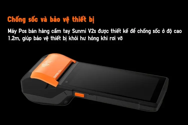 Máy Pos bán hàng cầm tay Sunmi V2s được thiết kế để chống sốc ở độ cao 1.2m, giúp bảo vệ thiết bị khỏi hư hỏng khi rơi vỡ.